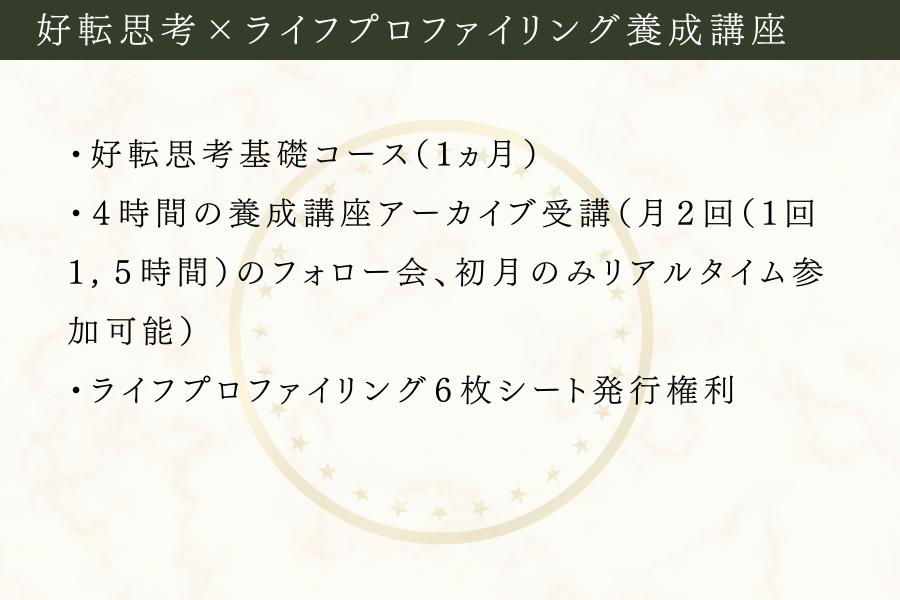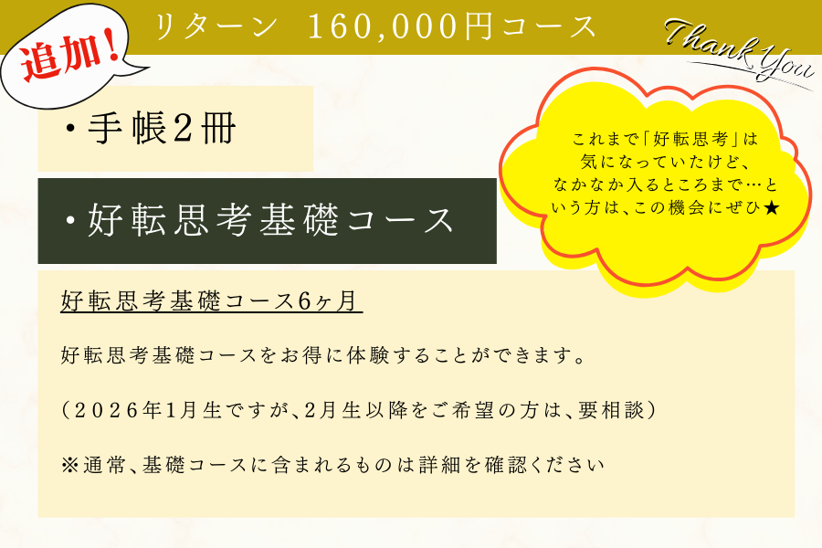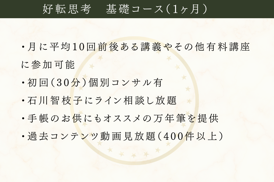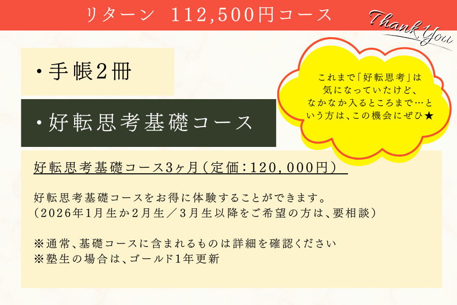 ・好転思考基礎コースをお得に体験することができます。(2025年12月生、2026年1月生からお選びいただけます)※2025年2月生以降をご希望の方は、要相談。